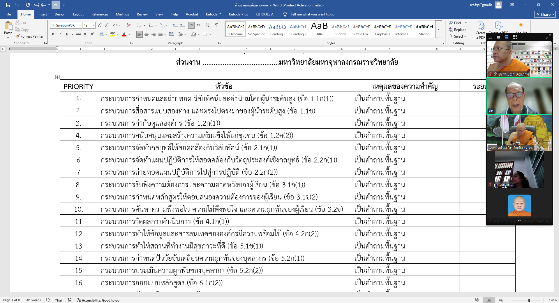 💎 1. การวิเคราะห์และจัดลำดับความสำคัญ (Prioritization): เน้นการคัดเลือก “โอกาสในการปรับปรุง” (OFI) จากรายงานผลการประเมินปี 2567 โดยมุ่งเน้นที่ “คำถามพื้นฐาน” (Basic Questions) ของแต่ละหมวด เช่น การถ่ายทอดวิสัยทัศน์และการจัดทำกลยุทธ์ พร้อมทั้งระบุเหตุผลความสำคัญเพื่อความคุ้มค่าในการใช้ทรัพยากรของส่วนงาน